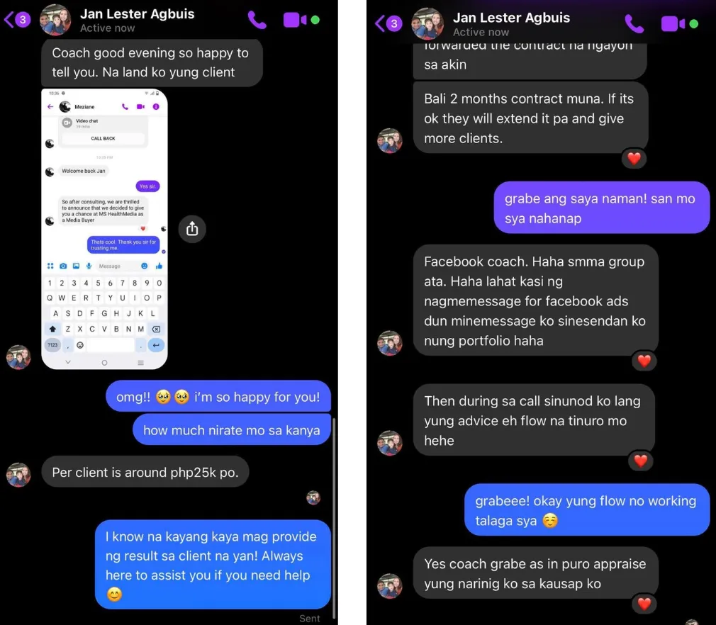 I went from a fixed ₱15,000 salary to managing ad accounts across multiple industries — ecommerce, coaching, local businesses, and B2B. I scaled campaigns with millions in ad spend. I built systems that worked. I got results that kept clients coming back.